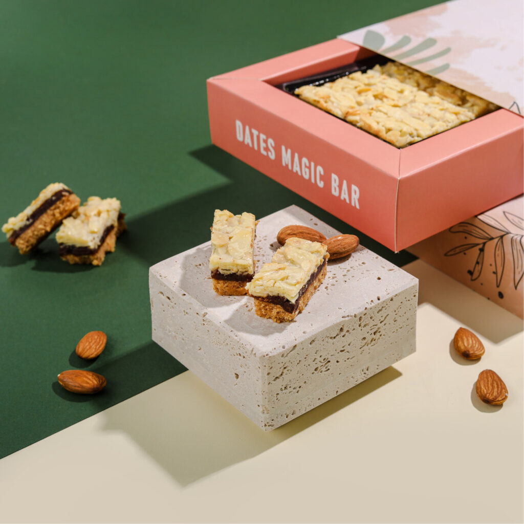 شوكولاتة بطبقات بسكويت مع حشوة تمر خاصة وشرائح لوز مكرملة.